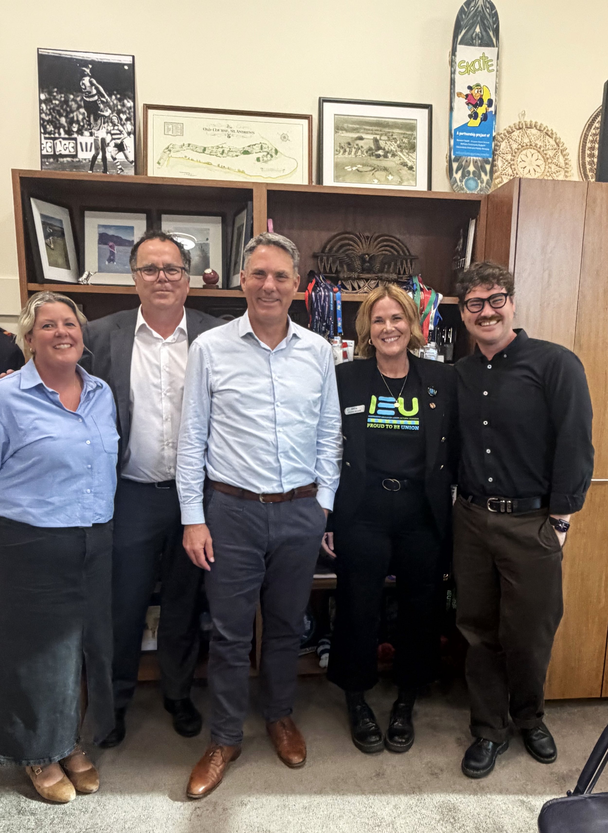 Rep Lauren Hall, IEU General Secretary David Brear, Deputy PM Richard Marles, Organiser Heather Macardy and Rep Charlie Purdy